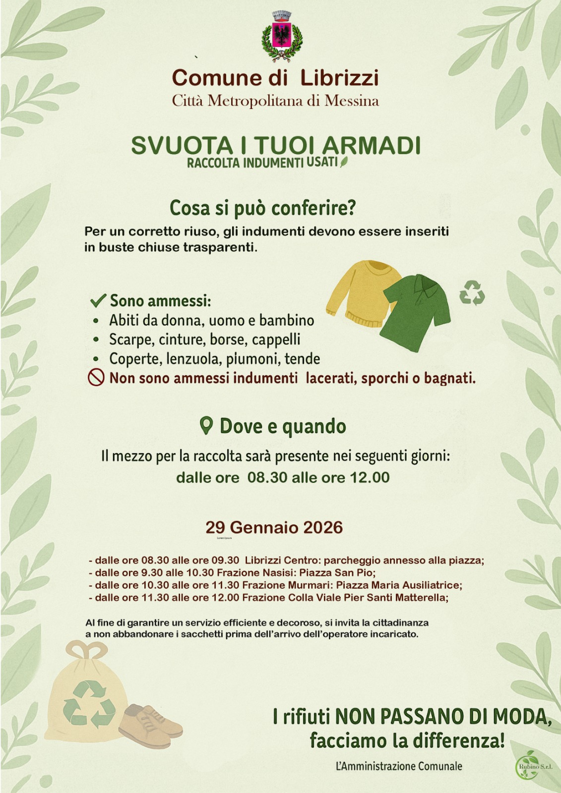 Il mezzo per la raccolta sarà presente, giorno 29 Gennaio 2026: